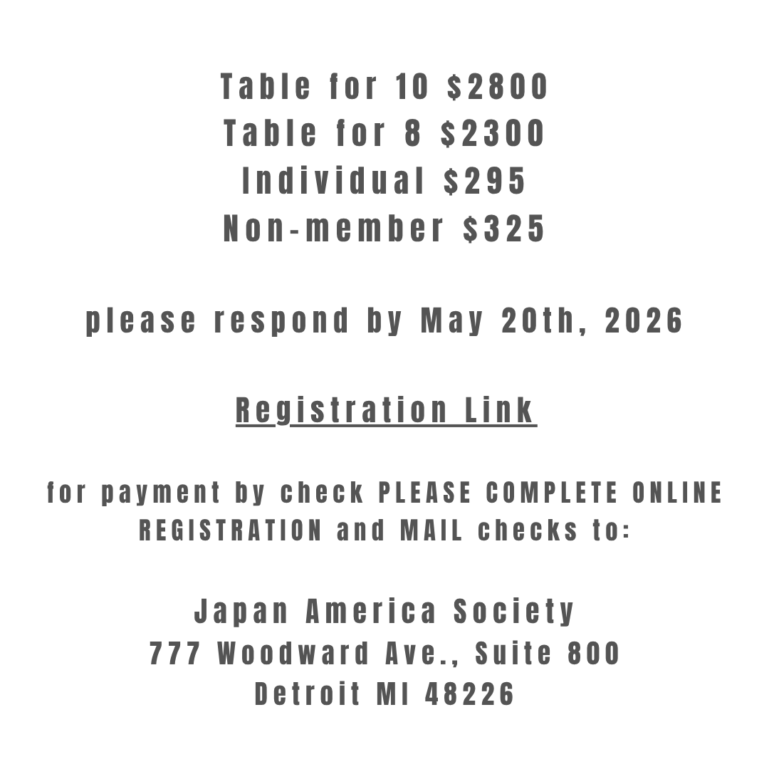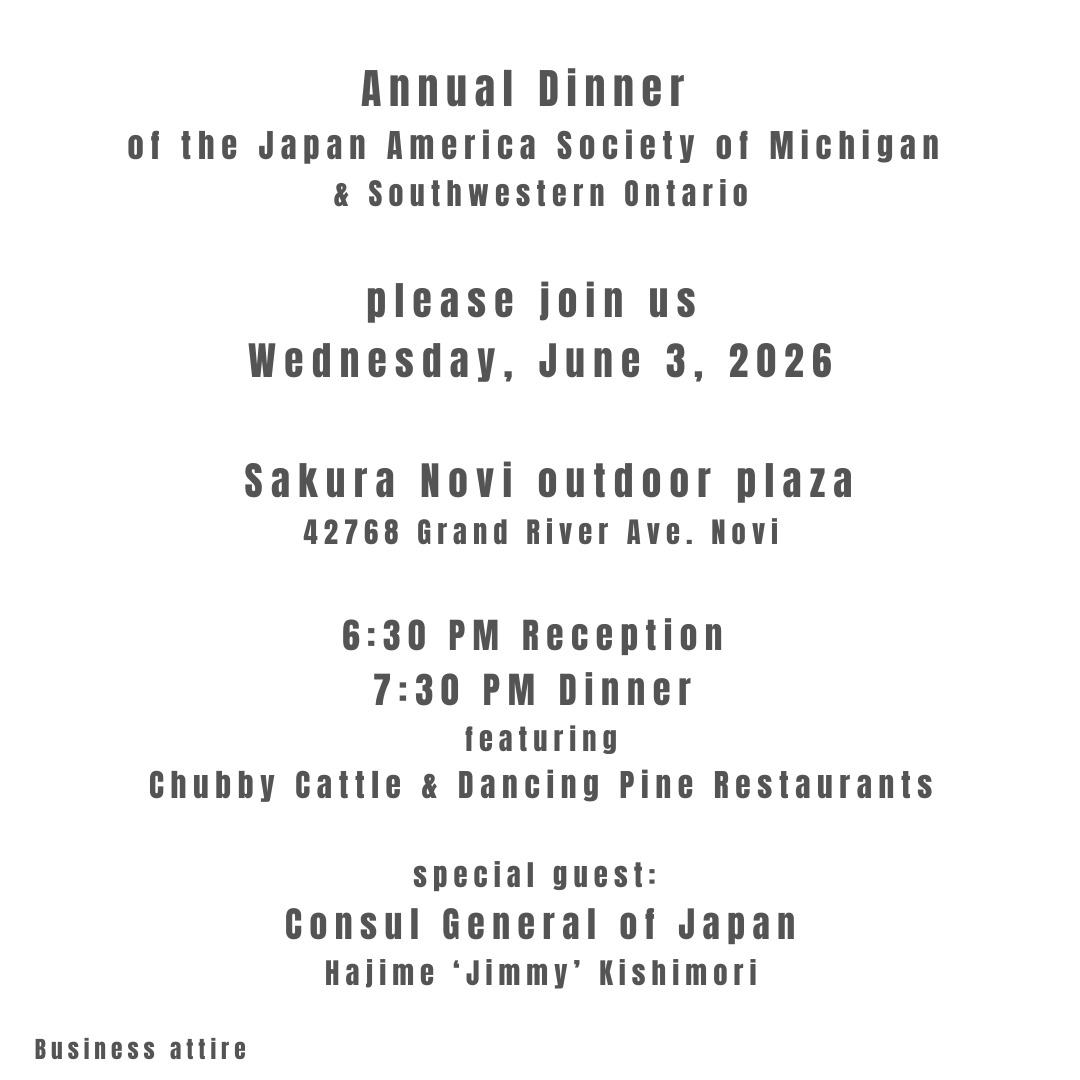 Annual Dinner 2026 Wednesday, June 3, 2026 6:30 PM 9:30 PM 18:30 21:30 Sakura Novi 42768 Grand River Avenue Novi, MI, 48375 United States (map) Google Calendar ICS Annual Dinner 2026 Sakura Novi from $295.00 Choose table size or individual seats below. Tickets, Individual and Tables: Select Tickets, Individual and Tables Individual Table of 8 Table of 10 Non-Member Add to cart Annual Dinner Sponsorship Opportunities Link for Sponsorships